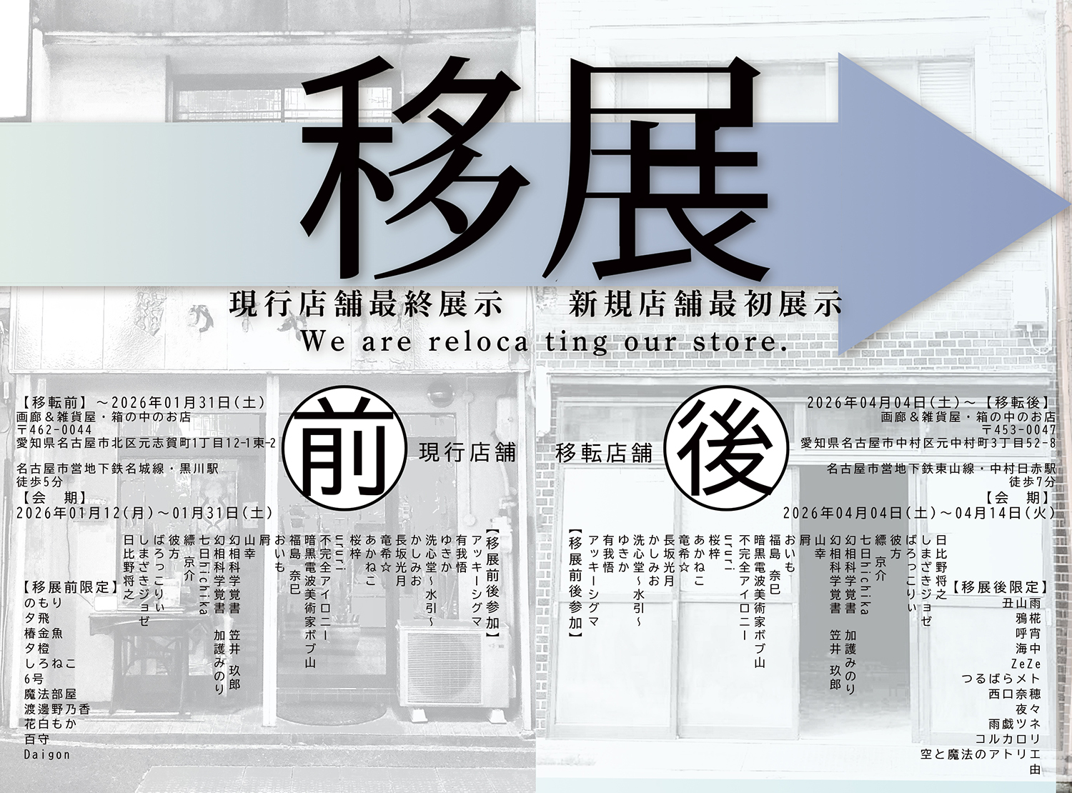 2026年01月一杯で箱の中のお店は現行店舗の取り壊しにつき、移転をします。それに伴い、現行店舗での最終展示としてテーマ無、平面、造形、映像なんでもOKかつ、サイズ制限無し、参加費無料の「移展(前)」を開催いたします。2026年04月には新店舗に移転予定となります。移転先の最初の展示は同条件で「移展(後)」として開催します。いずれもギャラリースペースの押し入れや床の間等、好きな場所に展示していただけますので、是非ご参加をお待ちしております。